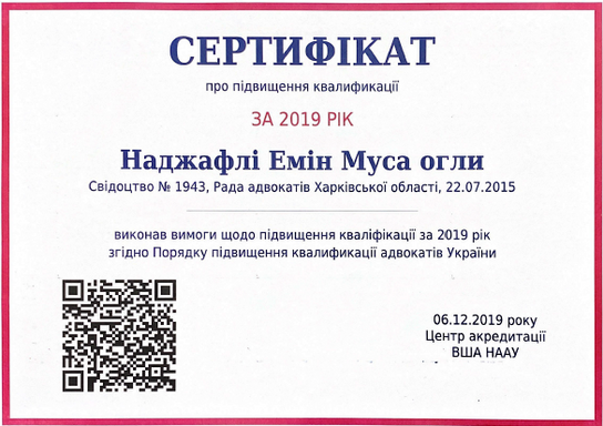• 2019 – захистив дисертацію на здобуття ступеня кандидата юридичних наук «Адміністративно-правові принципи адвокатської діяльності в Україні».