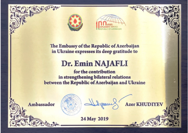 • 24 травня 2019 року – отримав подяку від Надзвичайного і Повноважного Посла Азербайджанської Республіки в Україні Азера Худієва за розвиток українсько-азербайджанських відносин.